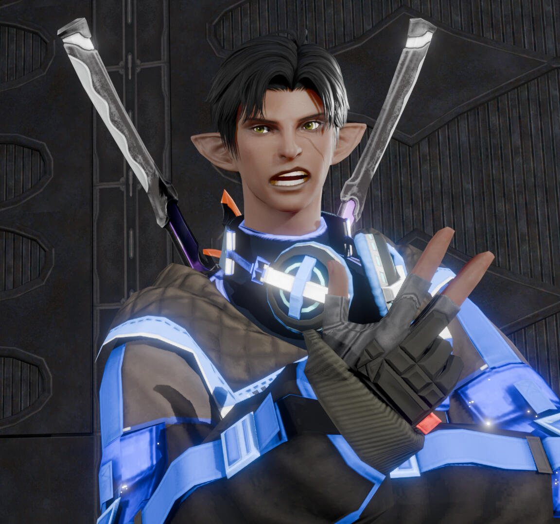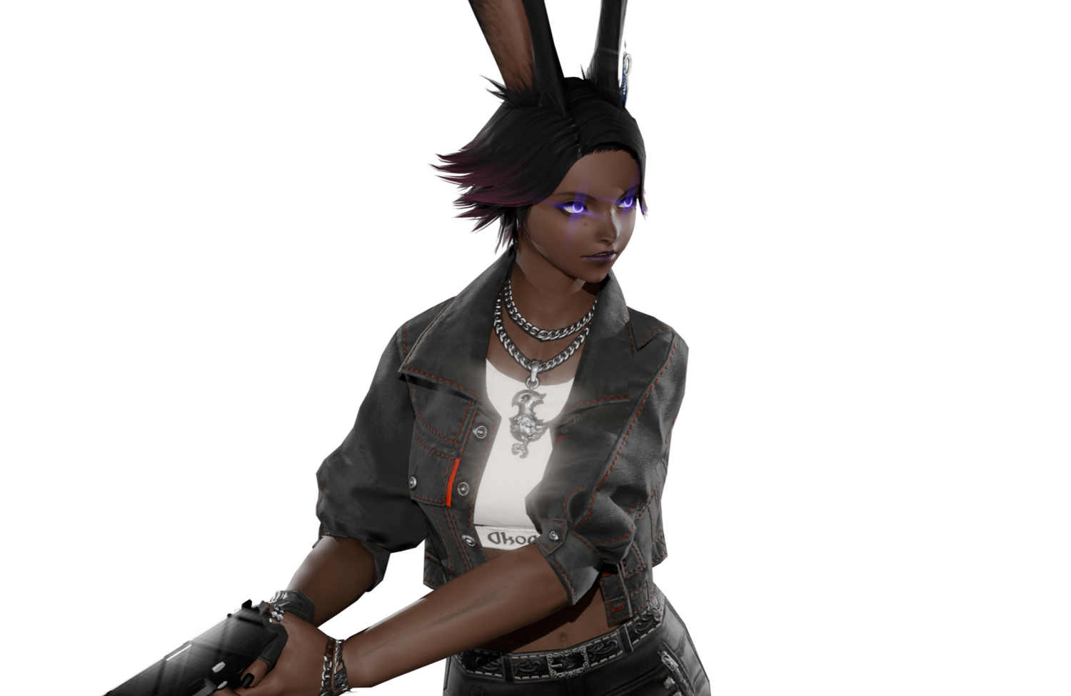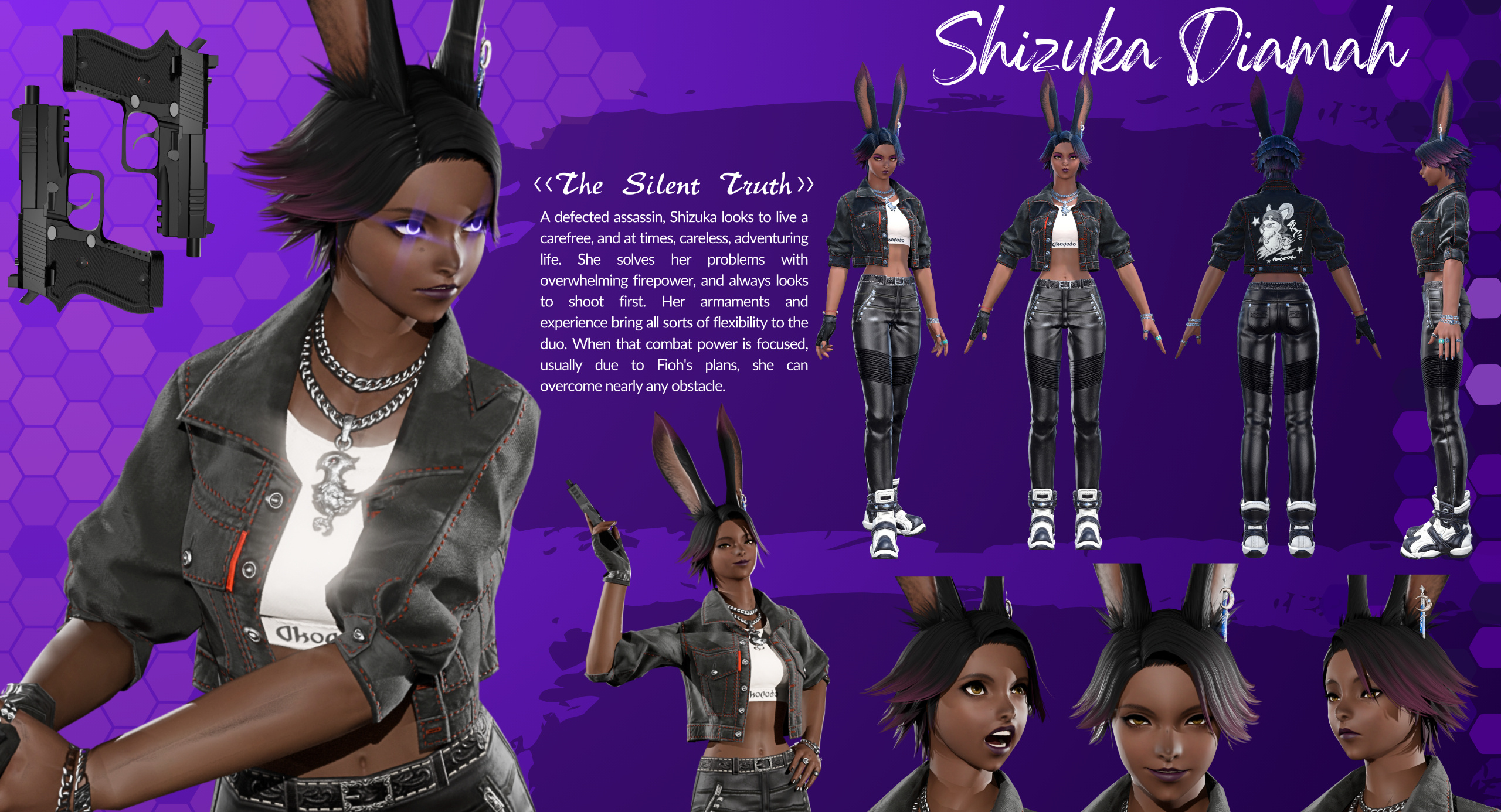 Shizuka was raised from birth to become an assassin for “New Eclipse”, a company that is tasked to “shape the world” for their clients. The trainees are cloaked, with their voices artificially changed to remain anonymous to all trainers, preventing favoritism or attachment. She showed exceptional skill with firearms and daggers, and boasted physical strength unbecoming of her physical stature. After years of high-performance, the company invested in even further improvements for her, giving her specialized equipment and even further training.Her special talents earned her the codename “The Silence”. This codename was not a reflection of her method of operation, but rather what was left in her wake when she completed her mission. She specialized in short range weaponry and close combat, complimented by high-mobility with her Hard-Light Boots, a technology developed by New Eclipse, specially designed for her.Her only connection to the outside world were a variety of children cartoons, comedies and dramas that were played on the building’s televisions. Most of her life was spent on training and on missions.Her final mission was one that was revealed to be so morally black, that even she understood the ramifications of her actions. She destroyed a shipment containing medicines for ailing children, without which, they would perish. She was told about the nature of the shipment from the client, after she and her handler met with them after the mission was complete. Understanding now the truth of her actions, her handler and client were found pulverized beyond recognition in the meeting room, with “The Silence” nowhere to be found.She ran from her captivity, and managed to temporarily conceal her identity from her pursuers. She changes her name to Shizuka Diamah, and applies to the Eorzea Academy as a new student.Obviously, she was no stranger to combat. She joined the Machinist course and glided through it. As her new personality, she tried to reflect what she saw on the shows on her TV growing up: ridiculous, random, silly, dramatic. This caused many people to view her as a wildcard and unpredictable. The other students avoided her, but she didn’t mind. She did not know what it was like to have friends, so she continued to be her wild, happy-go-lucky new-self.Eventually, she checked her situation. She went through different ways that New Eclipse could track her. She eventually found out that her phone was being monitored by some other entity. They probably didn’t recognize her with her new look and personality, and couldn’t commit to any action at a public place like the Eorzea Academy. She decides to throw off their trail.She decides to find a scapegoat, some non-threatening student with low scores and a low chance of standing out. She walks up to his desk and just starts speaking nonsense to him, asking him questions so nonsensical that he gets distracted from his surroundings and notably his phone on his desk. While distracting him, she exchanges the signal cards between their phones via signal, moving the tracker from her phone to his.The conversation ends rather heated after the student gets annoyed and insulted at her comments. But her mission was completed, and now all remaining traces of her existence are on him.Throughout the rest of her time at the academy, she sees him from time to time, and even learns that his name is Fioh. She acts as her new happy-go-lucky self around him, finding entertainment when messing with him.The day of the final exam arrives, and she is shocked to find out that she is paired with Fioh, the same person she made as a scapegoat. She even sees that he has developed new weapons for himself. He seems changed from the prospective dropout she saw before. The exam was a light challenge for Shizuka, and only so because she had to maintain her “wild rabbit” persona. Fioh, on the other hand, had grown much stronger.Their success created buzz about them, much to Shizuka’s dismay, as that means more eyes are on them than ever, and she has no clue which of these eyes are targeting her. Or Fioh.Seeing his hard work to better himself put her in a bind. She had marked him for death, and now it’s going to catch him faster than ever. No different from what she did before, dooming the children that needed the medicine. Realizing this, she pushes Fioh into becoming a duo adventuring team, to which he eventually agrees.Now, she maintains her happy-go-lucky persona around him as they protect the city and complete contracts. She watches and waits for the time New Eclipse makes their move on Fioh, and she has to be there when they do. She has to.