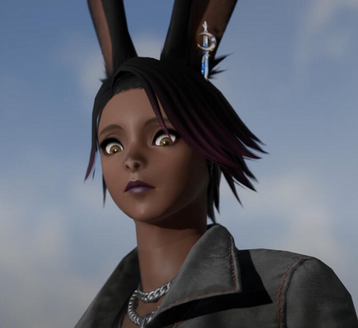 Shizuka, at surface level, is a happy-go-lucky carefree Viera who really should not be around firearms. She gets really excited about weaponry and tech, and she seems to become proficient with any firearm she touches.In combat, her carefree nature gets replaced with “crazed lunatic” as she typically overkills her enemies with every weapon she has at her disposal. She would clear out ground squirrels with a satellite laser. This is mostly to mask her personality as an assassin, that she has grown with all her life. There are moments where that personality arises, but they are few and far between, and usually with Fioh being none the wiser.She finds great joy in teasing and annoying Fioh, and others that she meets, with ridiculous events of her own making. These moments of happiness and ease are valuable to her, because these sorts of moments never happened during her childhood.She enjoys “hanging around and hanging out” around town and trying out every little thing that catches her attention. She is enthusiastic about trying out new experiences and even creating new ones for herself.On a deeper level, she is trying to figure out her place in the world as her new persona. Through what limited programs she could watch growing up, she had this ridiculous and artificial idea of how normal people would act. Pair that up with the fact that friends or kindness weren't a factor to her, and she ended up as “just a weird and ridiculous” person at the academy.Now, she keeps her worries about New Eclipse buried as she watches over Fioh. She is beginning to figure out and enjoys her new personality and she has even found a bit of joy as Fioh accepts this new side of her.
